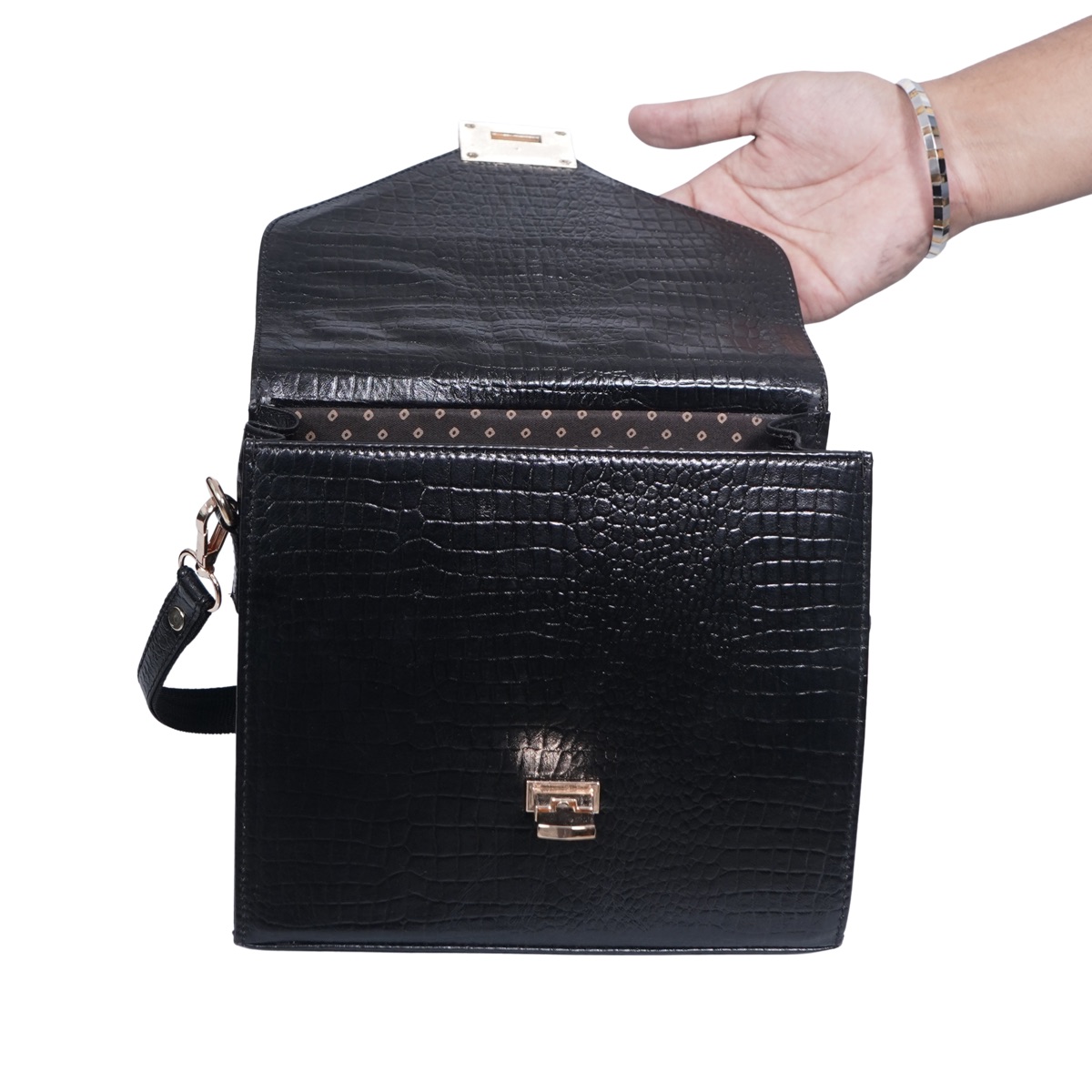 Elegant, premium, and classy handbag suitable for girls & women who prefer a stylish structured look. This top handle handbag features premium croco-textured faux leather with a smooth, glossy finish for a luxury appearance. The gold-tone metal lock closure and hard body structure maintain its sophisticated shape.